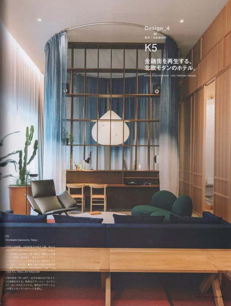 日本銀行與東京證卷交易所發跡地的東京日本橋,以往是日本知名金融街的日本橋,近年來因為金融產業數位化而逐漸改變,在這所要介紹的是由瑞典知名團隊CKR操刀,將擁有百年歷史銀行重新改建的複合型飯店「K5」。